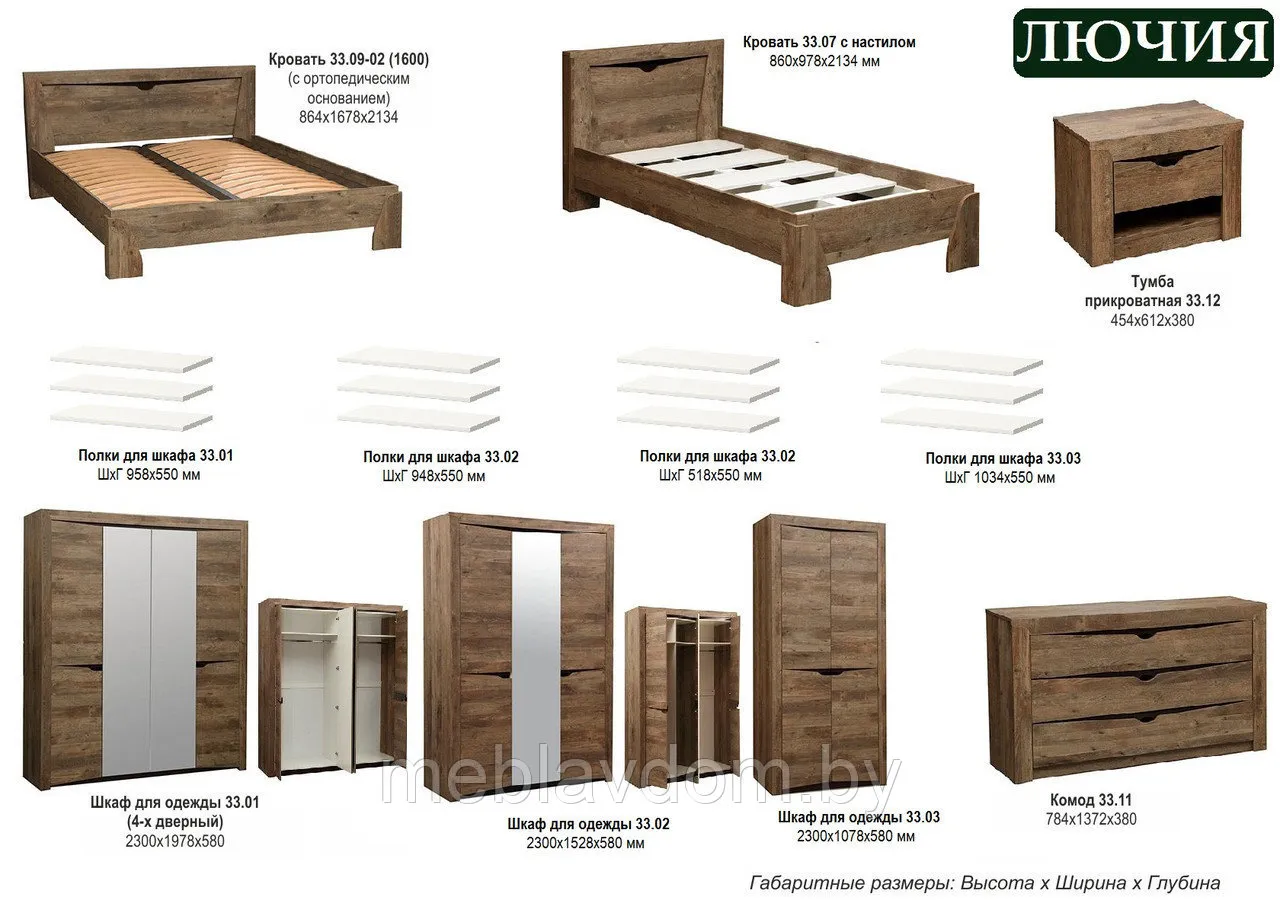 - Шкаф 33.02 Лючия Высота: 2300 мм. Ширина: 1528 мм. Глубина: 580 мм.
